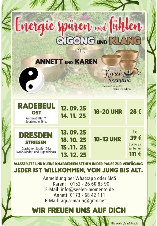 Hierbei kann die wunderbare Kombination von Qigong und Klang wahre Wunder vollbringen. Mit den sanften Qigong-Übungen richtet sich die Energie in deinen Organen wieder neu aus, so dass du dich wieder rundum wohl fühlen wirst. Der Klang bringt dich in eine Tiefenentspannung, in der deine Selbstheilungskräfte angeregt werden und du wirst dich gut erholt fühlen.